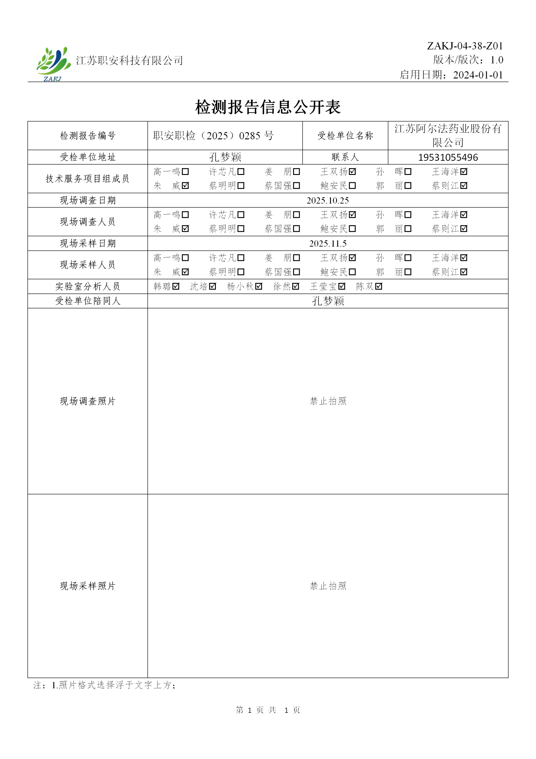 檢測報告編號 職安職檢(2025)0285號